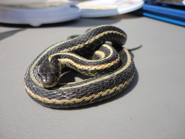 Delays in gathering materials, permits from Fish and Wildlife and a quick change from snow cover to summer-like weather almost postponed the census another season, but everything came together and the project was able to go ahead. With the drift fence up the snakes were observed, but not counted immediately. It was important to not disturb this essential time of spring emergence and breeding. Each morning during this time a wave of snakes would leave the den to bask wherever it was sunny. Then they would return to the den or males would follow females in gatherings known as mating balls. Almost immediately after the sun set the snakes would disappear into the den or under cover for the night. After mating activity decreased and snakes trying to leave were gathering, collection traps were placed at various locations inside the fence.
